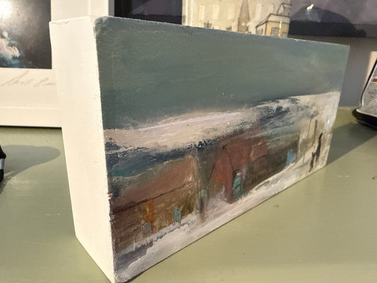Hirwaun 1982 painting on a wood block by Sarah evans