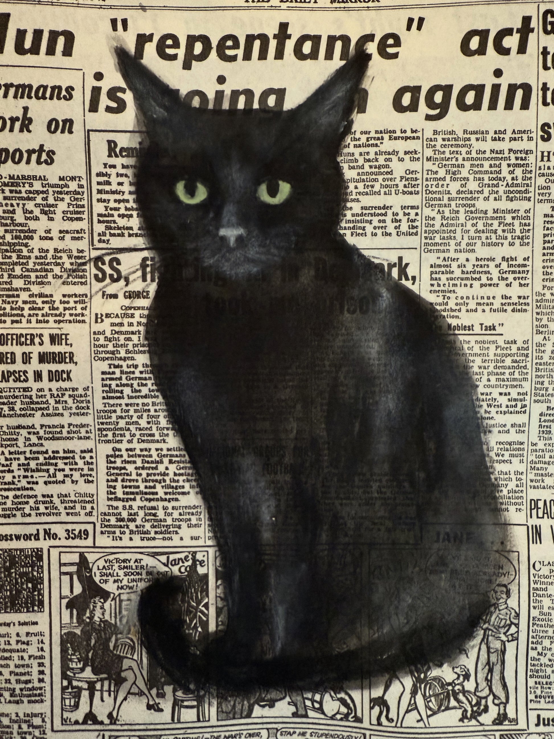 Original painting ink and pencil on vintage copy of newspaper 1945